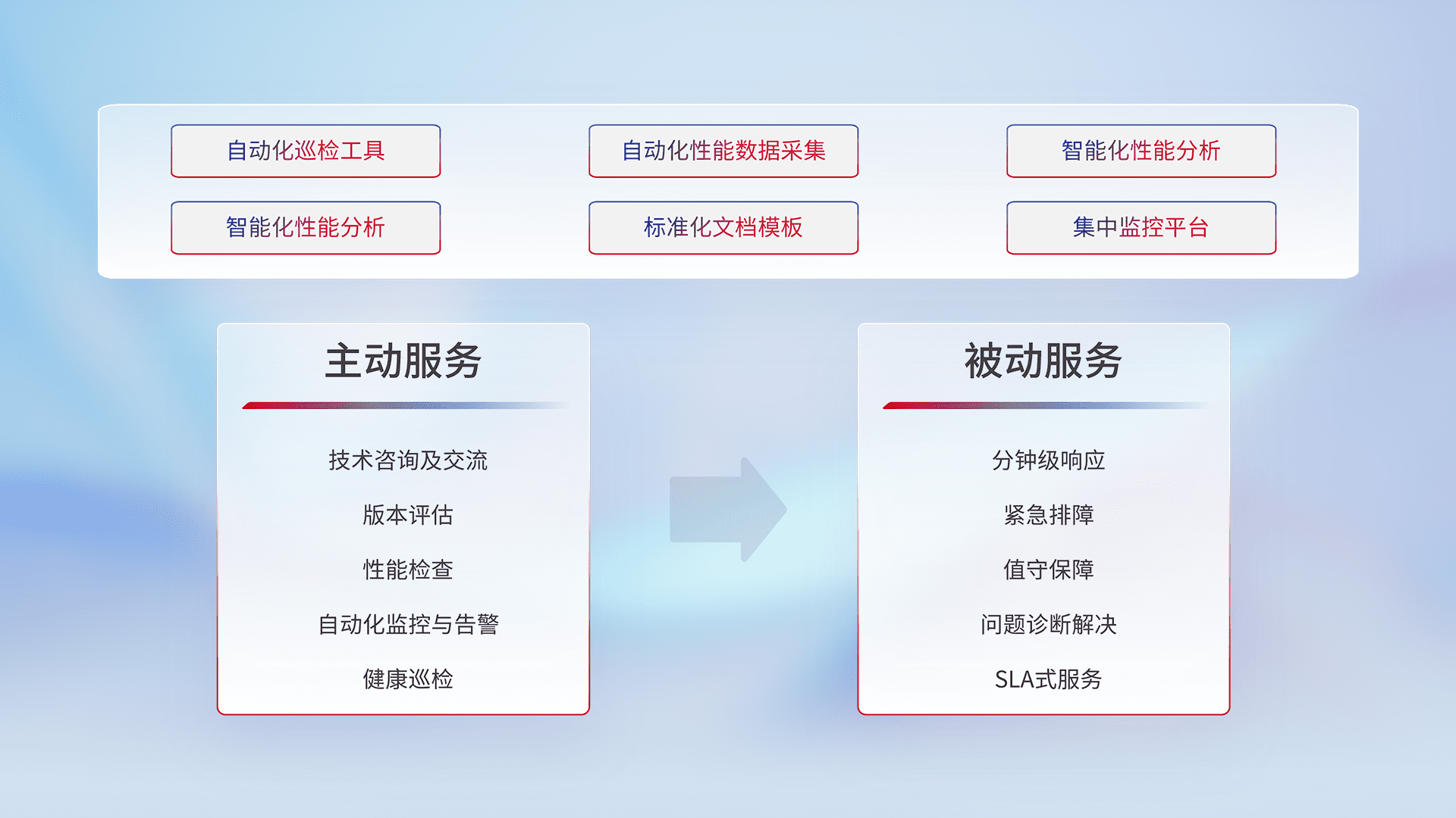 智能化工具和标准化文档,,,,保障服务质量,,,,提供主动服务(包含技术咨询、、、版本评估、、性能检查、、、、自动化监控与告警、、、、健康巡检)和被动服务包含(分钟级响应、、紧急排障、、、值守保障、、、问题诊断解决、、、、SLA服务)。。。