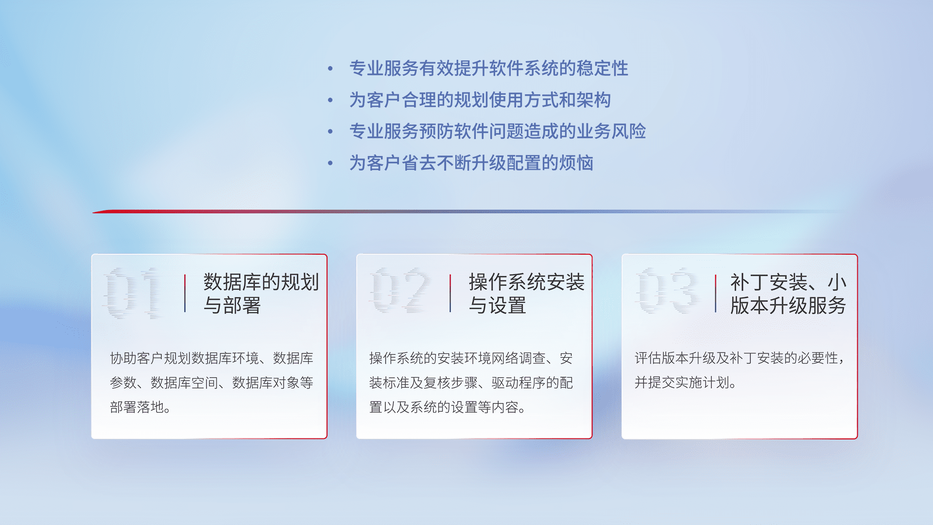 为客户提供软件规模升级、、、快速部署、、按需配置的专业服务,,从数据库的规划与部署到操作系统的安装与设置,,,,再到补丁安装和小版本升级提供支持。。。